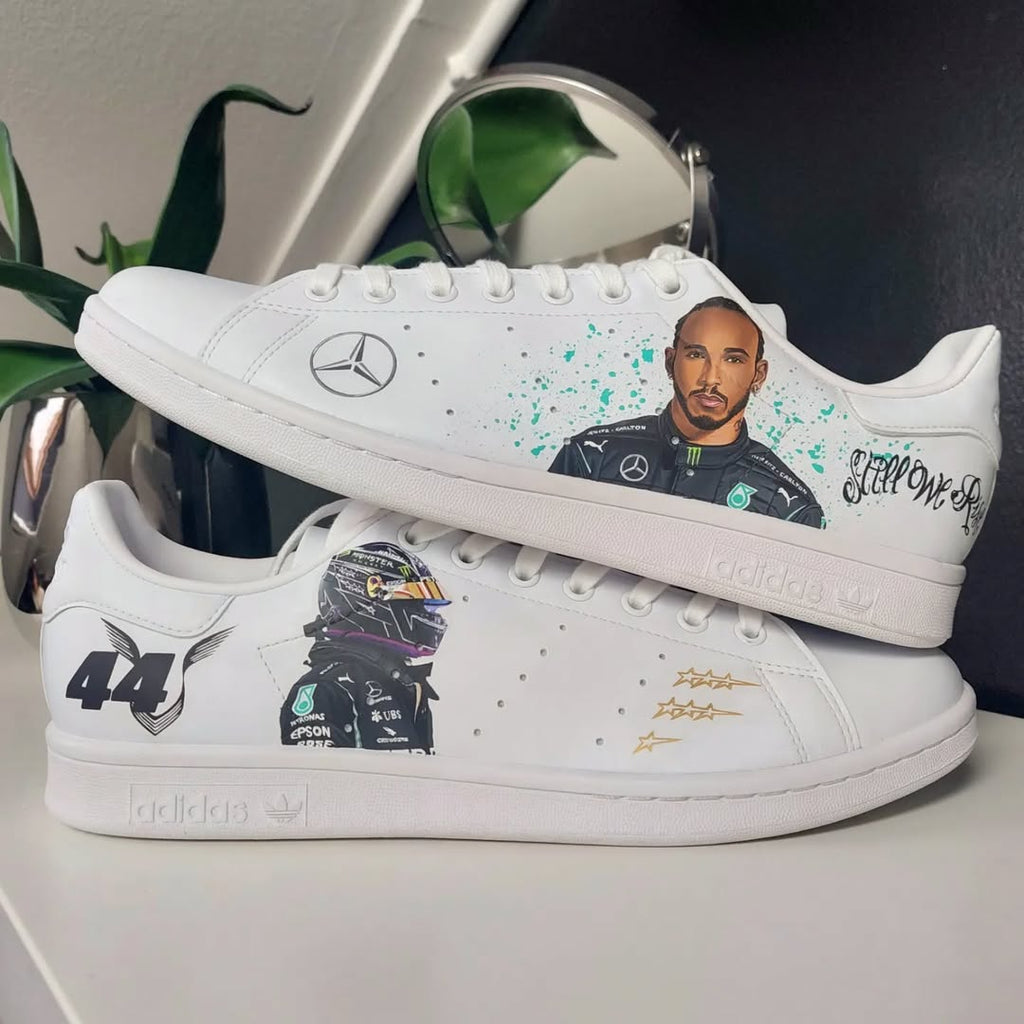 Order your Custom Hand Painted Adidas Stan Smith Sneakers today and step out in style with a pair of sneakers that are truly works of art! Lewis Hamilton inspired Mercedes AMG F1 Custom