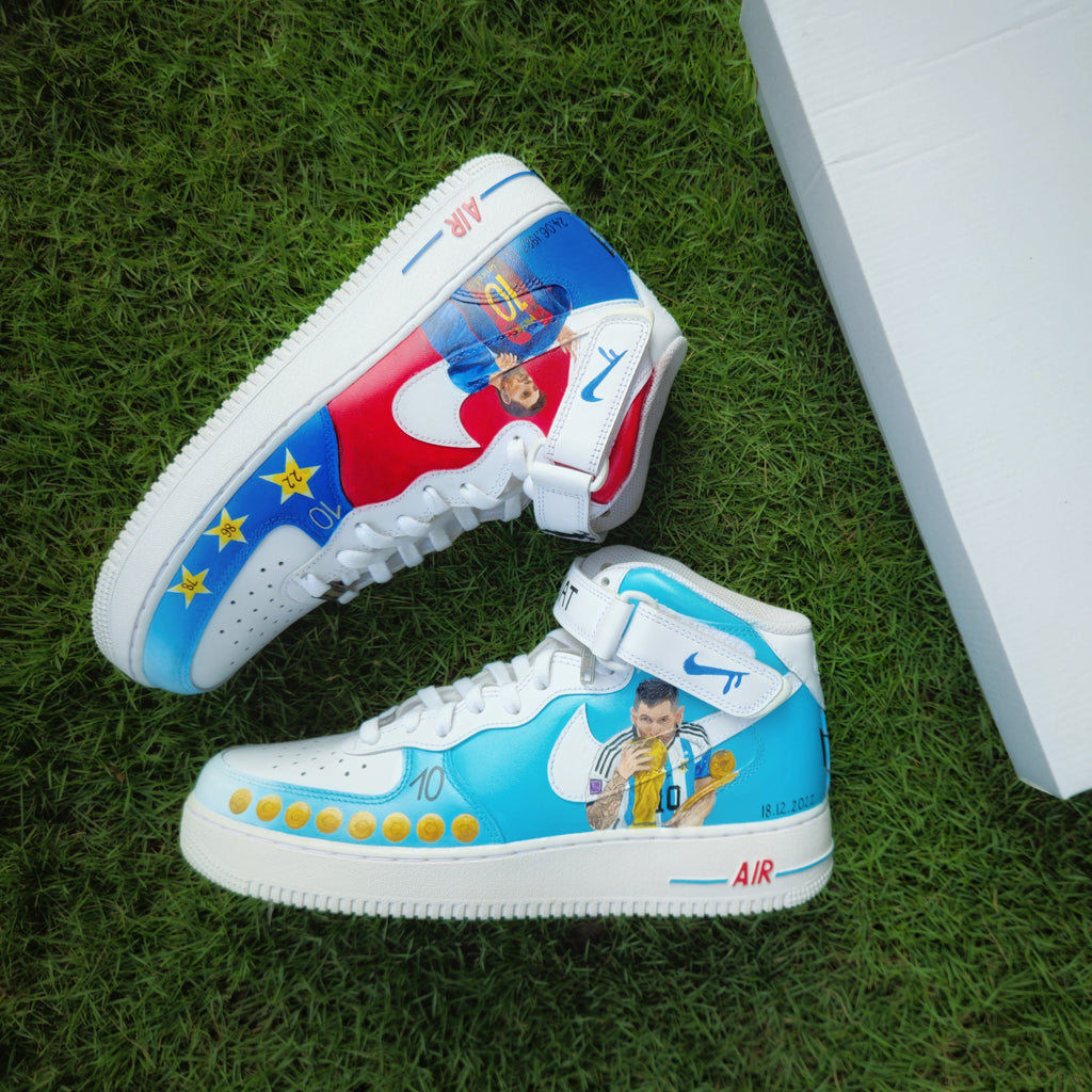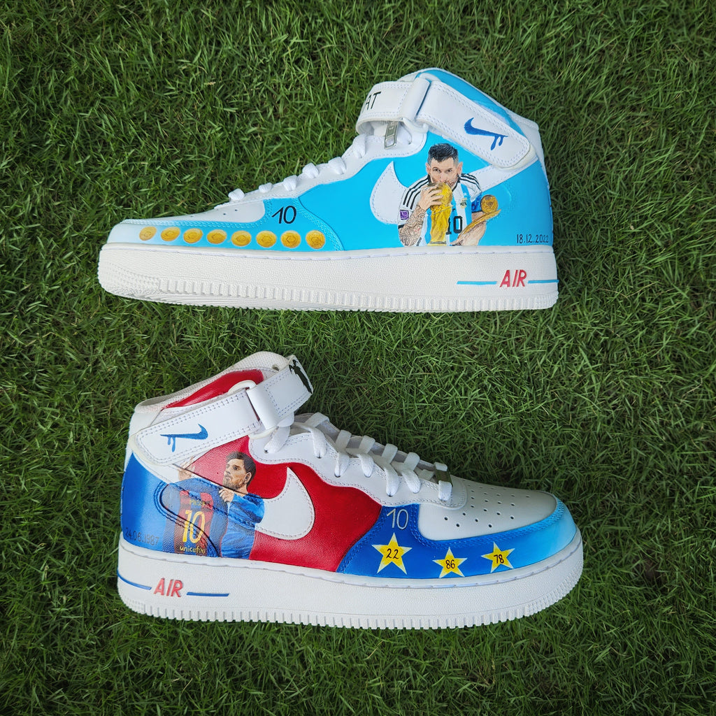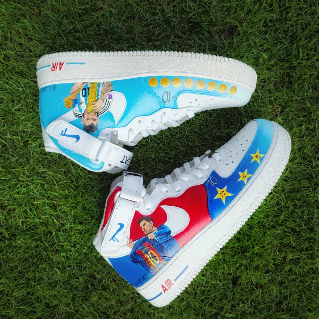 Introducing our unique and eye-catching Custom Hand Painted Nike Lionel Messi Barcelona x Argentina theme Sneakers! These sneakers are the perfect blend of style, art, and personalization, making them a must-have for any sneaker-head or Football enthusiast. Messi Fifa worldcup winning