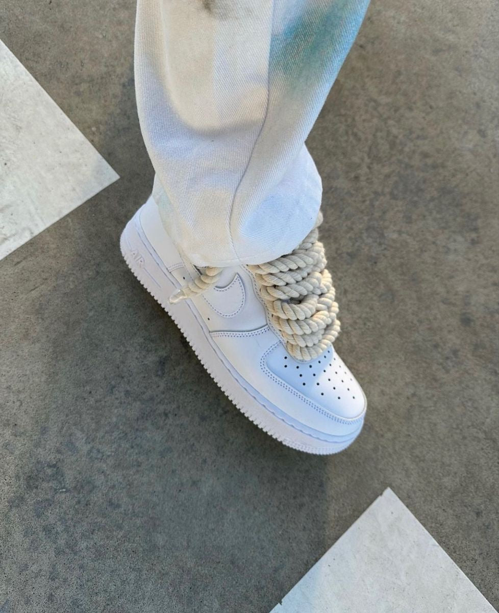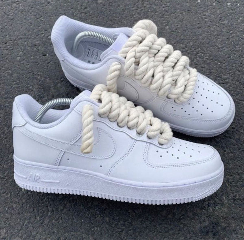 Introducing our unique and eye-catching Custom Nike Air Force1 With Biege Rope Laces (Includes pair of laces for both shoes) These sneakers are the perfect blend of style, art, and personalisation, making them a must-have for any sneaker-head or fashion enthusiast. 10 mm width