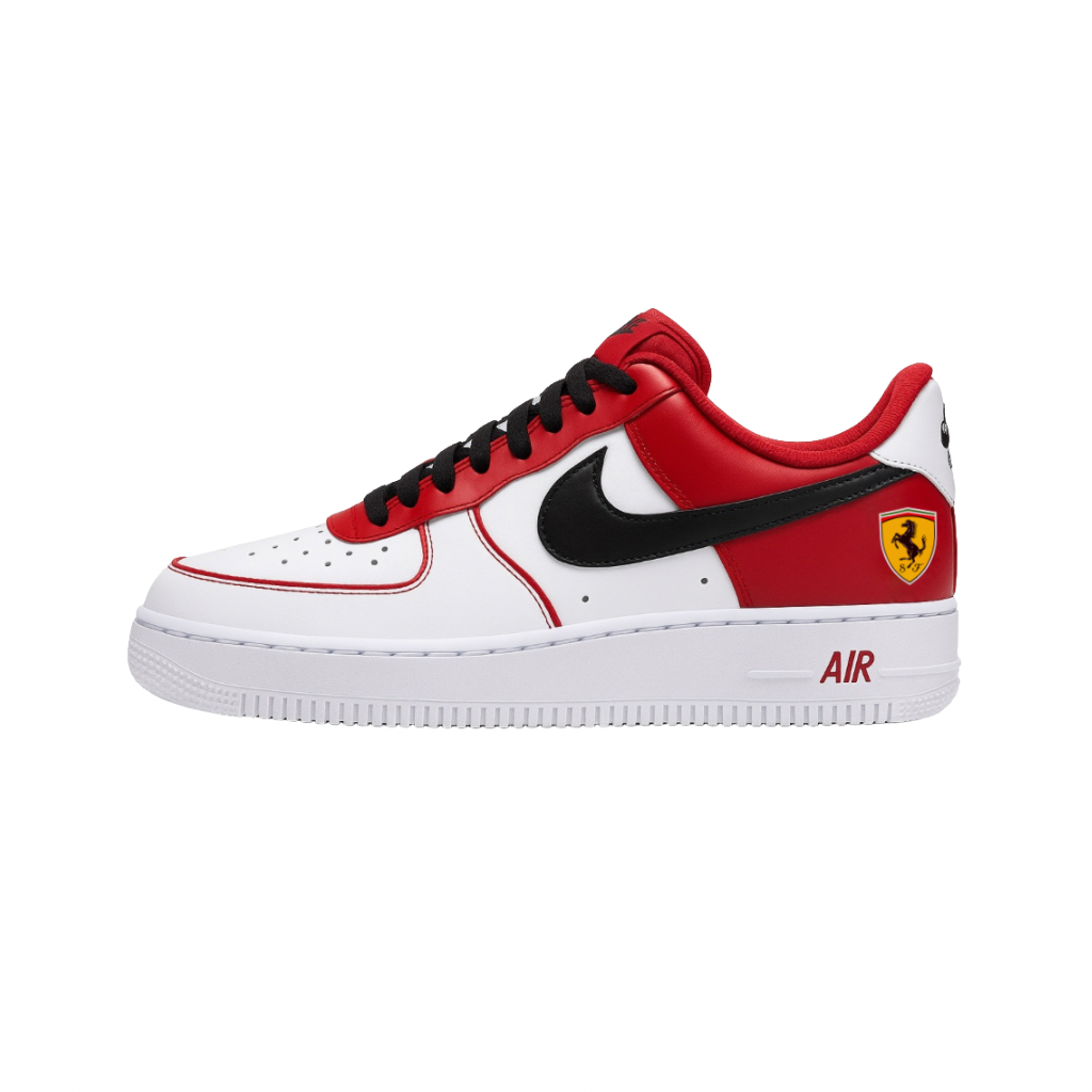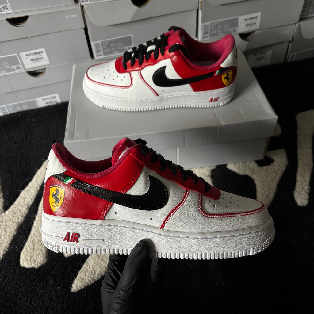 Speed meets style with the Nike Air Force 1 x Ferrari Edition — a luxury-inspired custom sneaker that blends the iconic silhouette of the AF1 with Ferrari’s unmistakable red-and-black racing heritage. Designed for sneakerheads, collectors, and motorsport fans, this pair embodies power, precision, and performance in wearable art.