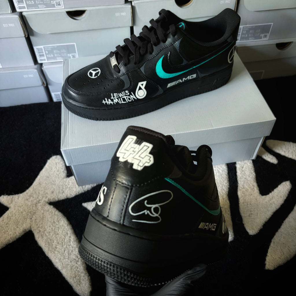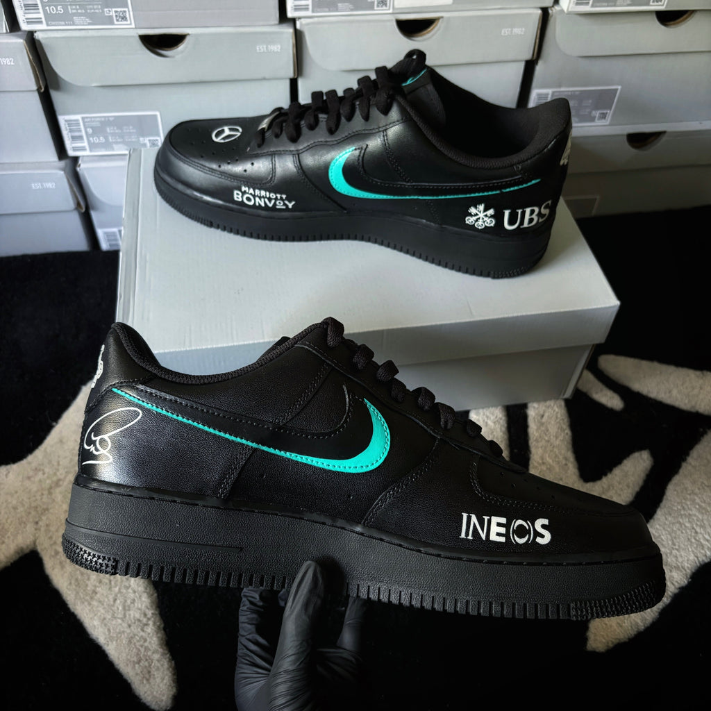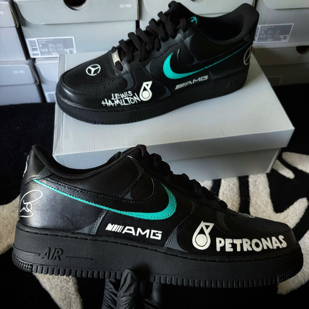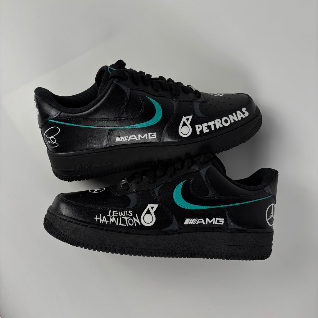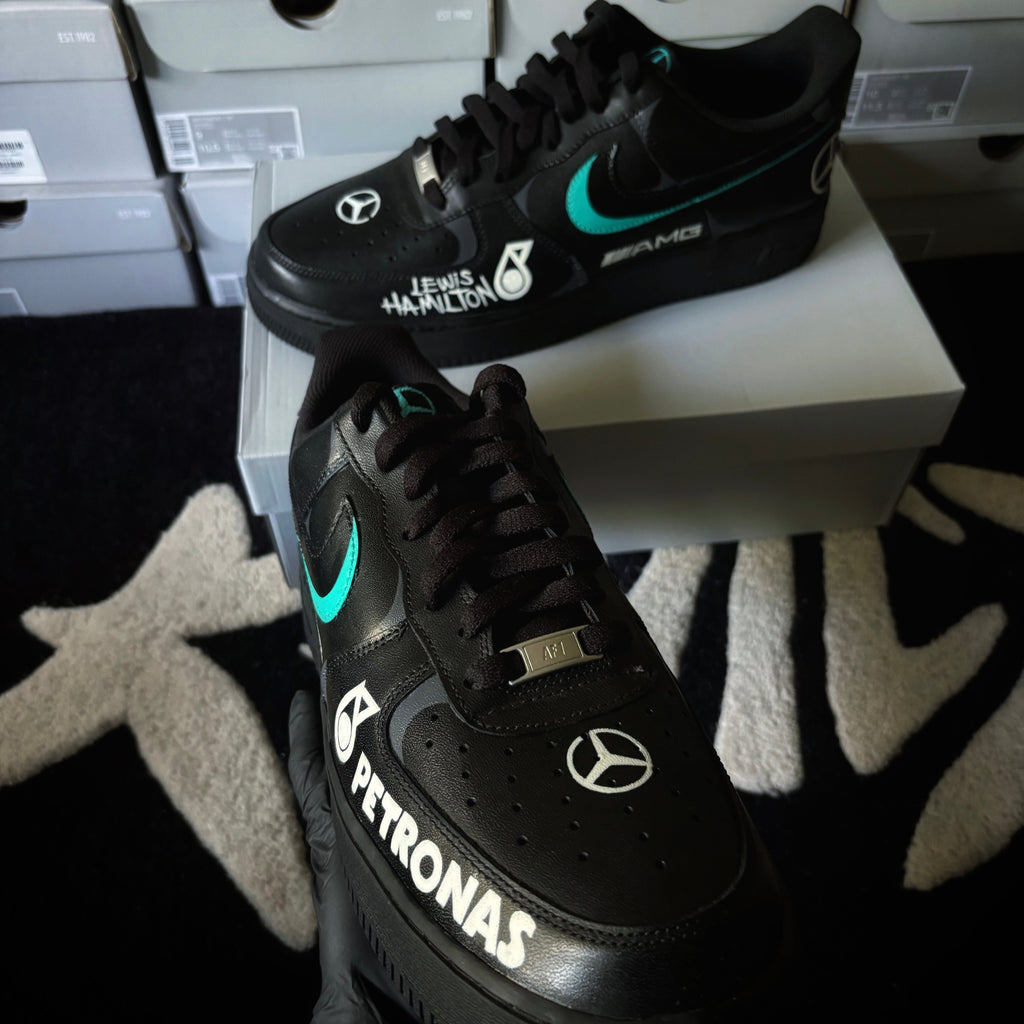 Introducing our unique and eye-catching Custom Nike Air Force 1 inspired by Lewis Hamilton and Mercedes-AMG Petronas. Featuring teal accents, AMG and Petronas branding, and a bold tribute to F1 dominance. A must-have for racing and sneaker fans alike