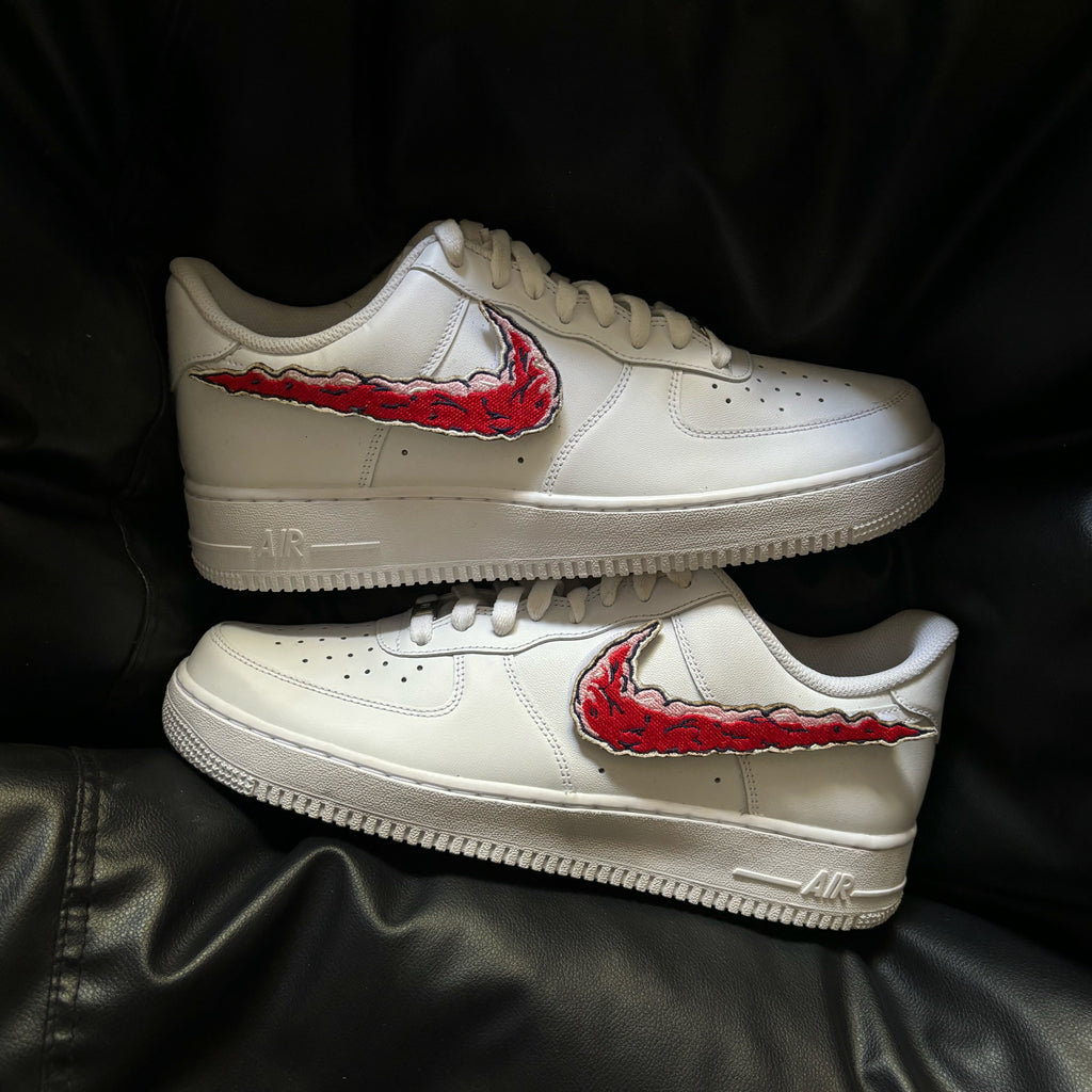 Custom AIR FORCE 1 Red Venom with velcro embroidered swooshes. You can change the designs as per your outfit and liking. The hook and loop velcro is very strong, you will never have to worry about falling off. Made on 100% Original Nike sneakers